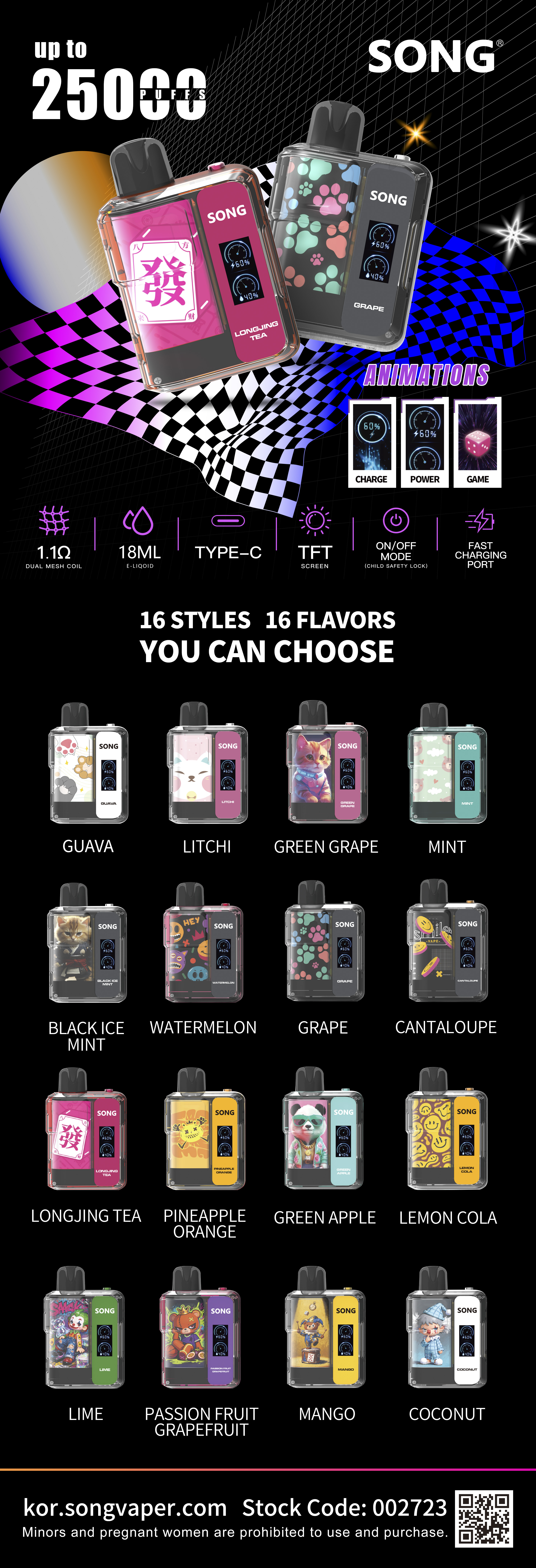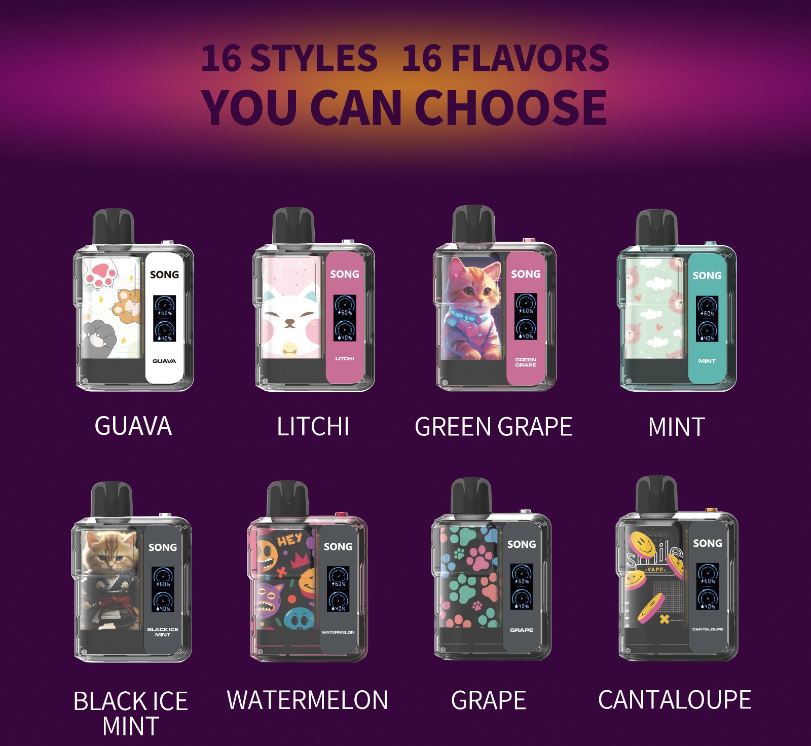 구아바 / 리치/라이치 / 블랙 아이스 민트 / 포도 / 캔탈루프 / 청포도 / 민트 / 롱징 차/ 龙井차 / 수박 / 레몬 콜라 / 파인애플 오렌지/파인오렌지 / 라임 / 패션프루트 자몽 / 청사과 / 코코넛 아이스